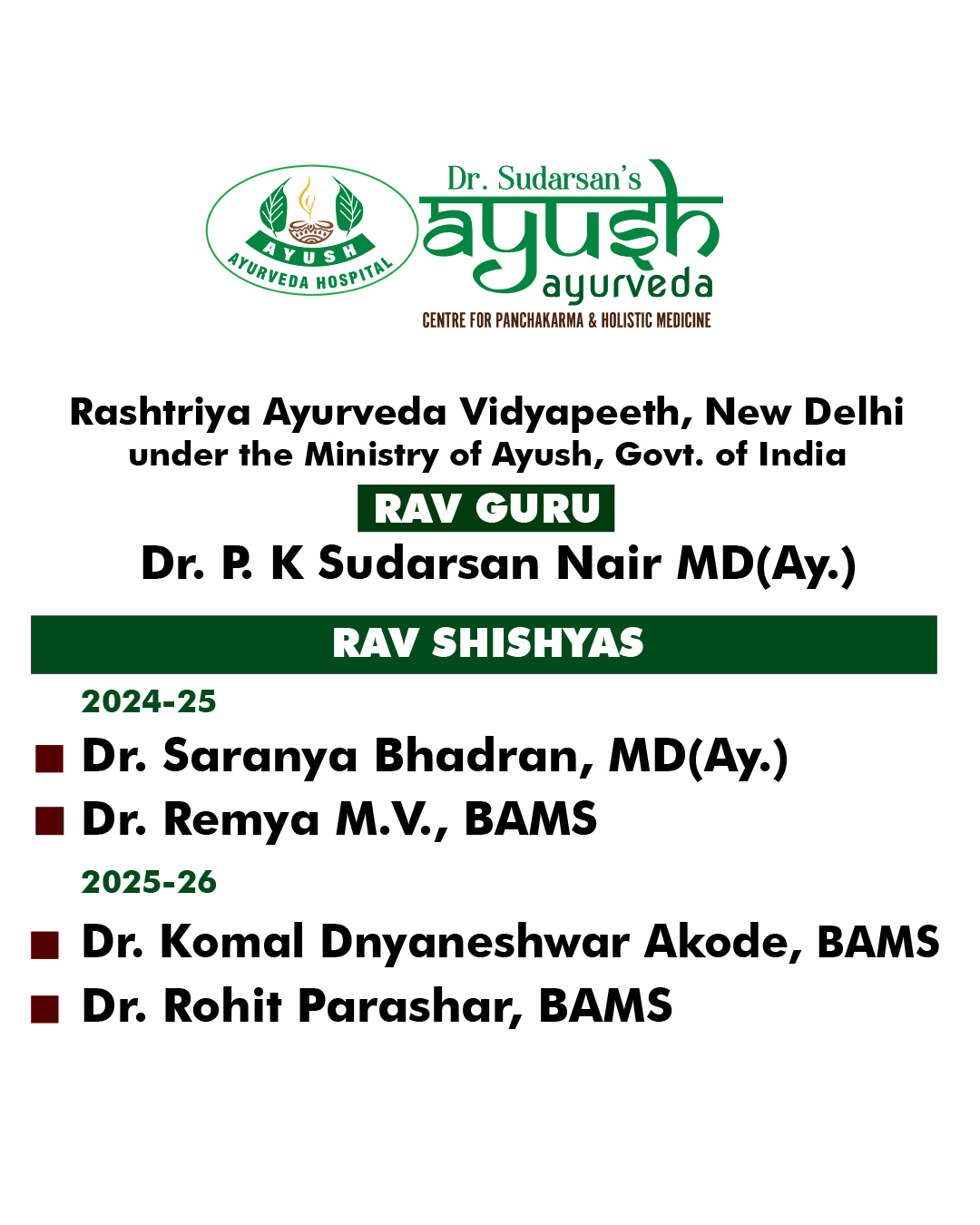 Dr. P.K. Sudarsan Nair, MD(Ay.), who belongs to the traditional lineage of Ayurvedic practitioners, is a highly qualified and experienced Ayurvedic Physician as well as a Researcher. He has successfully developed specialized treatment modalities for various Neurological, Neuromuscular and Rheumatological problems out of his rich experience in clinical research & practice for over four decades. Doctor Joined in Central Council for Research in Ayurvedic Sciences, under the Ministry of Ayush, Govt. of India in the year 1980, and worked in various capacities at various Research Centers in India. He retired from service as Assistant Director in Charge in the year 2014 from National Research Institute for Panchakarma after 34 years of meritorious service. Ayush Ayurveda Hospital was a dream venture of Dr Sudarsan which was established in the year 2000 with the vision to be the Centre of Excellence in the field of Ayurvedic treatment and research for comprehensive management of acute and chronic disease conditions. By God's grace and with the blessings of his Grand Father, Vaidya P.K. Kesavan Nair, Ayush has earned the trust and valuable support of patients and the public for its unstinted commitment and dedicated service in the field of healing and healthcare.